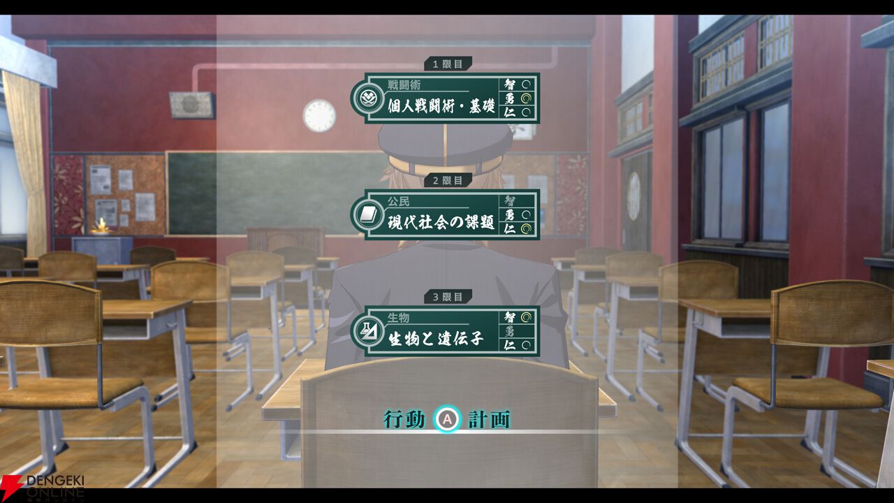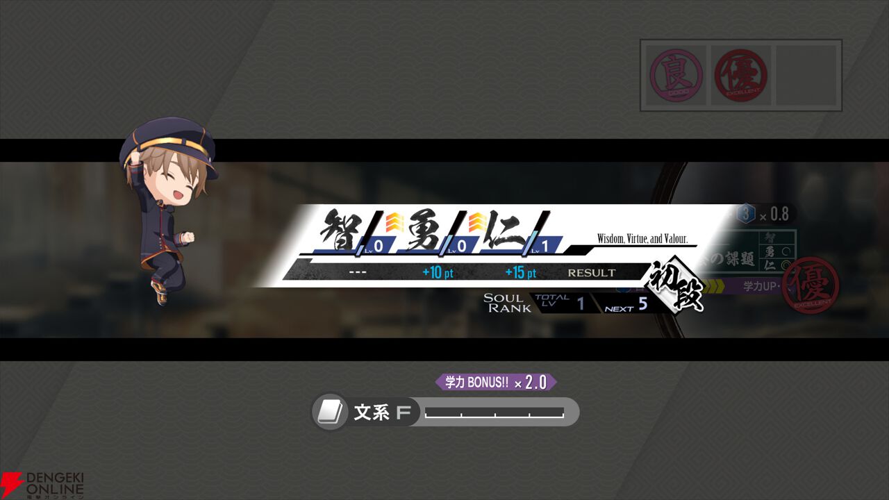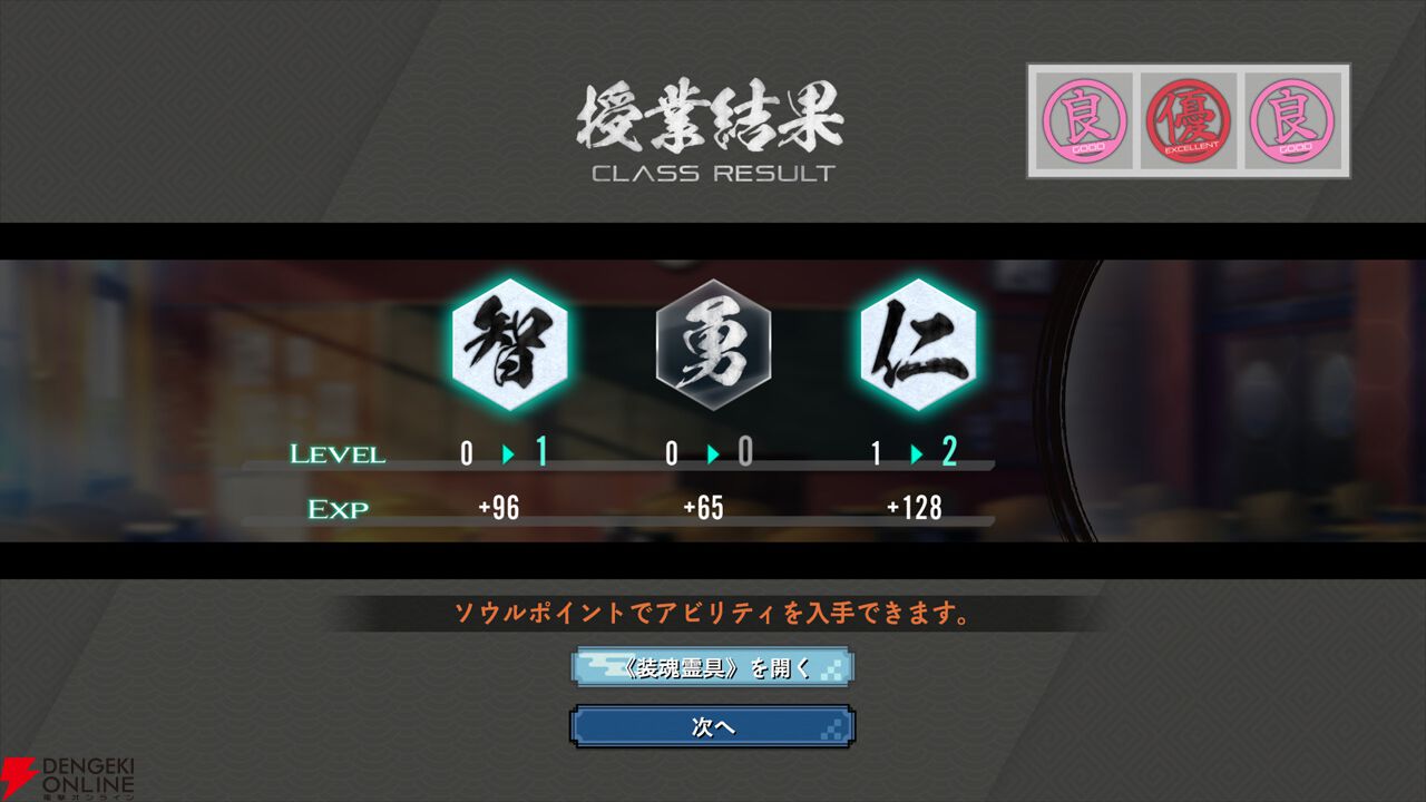 『亰都ザナドゥ -桜花幻舞-』では、比良坂学園で授業を受けることで《装魂霊具(ソウルデヴァイス)》を強化するための魂の力“智・勇・仁”を高めることができます。