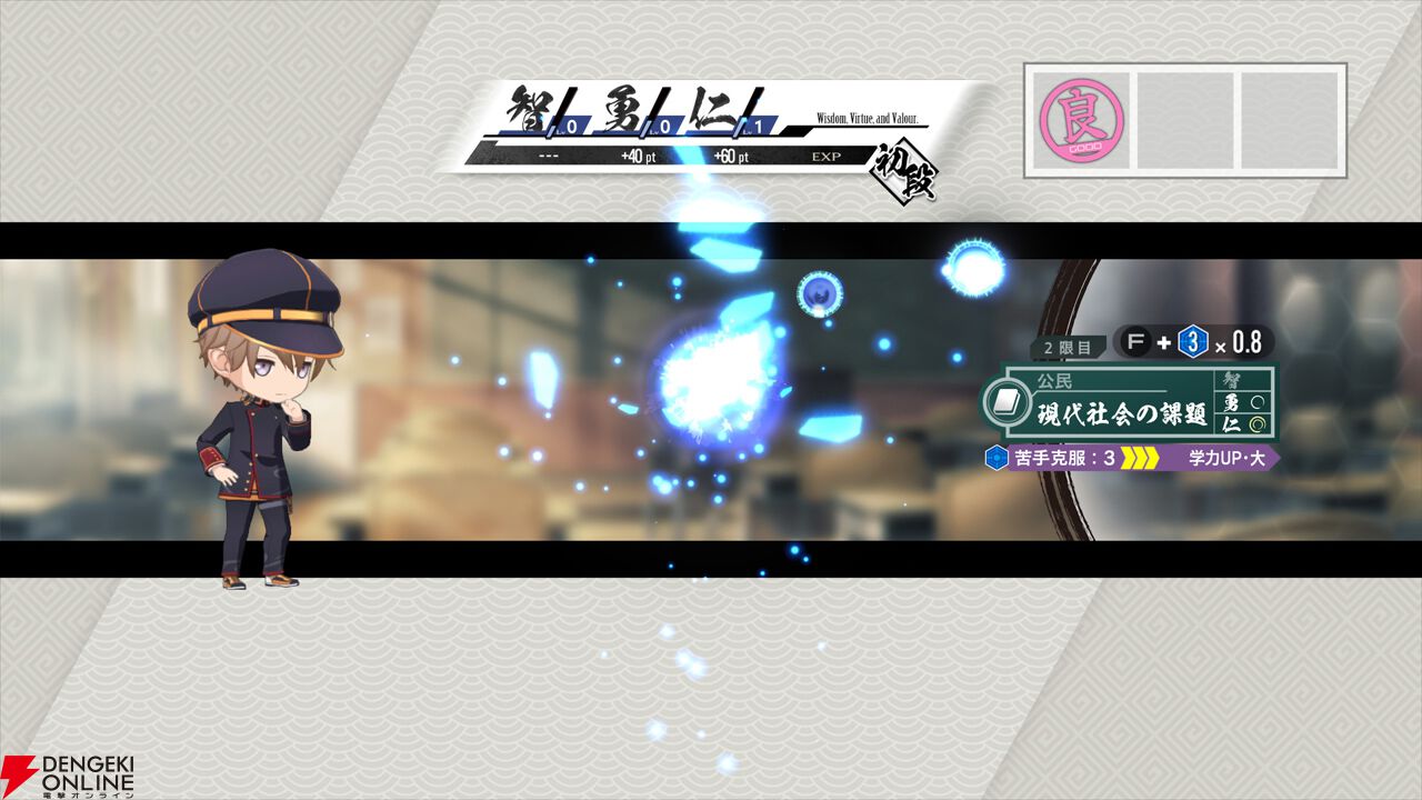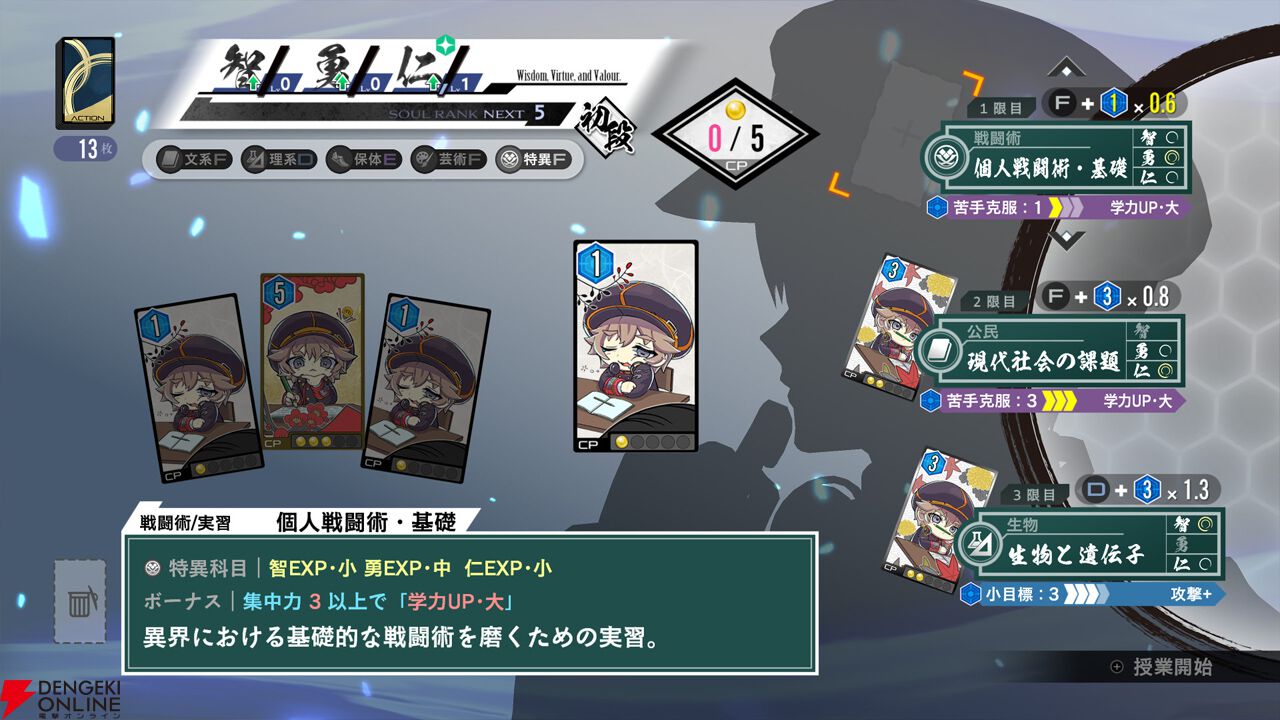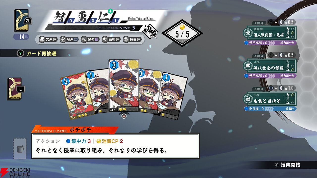 ・授業準備中に「行動カード」を使用し、集中力を高めることで“智・勇・仁”の獲得ポイントを増やすことができます。