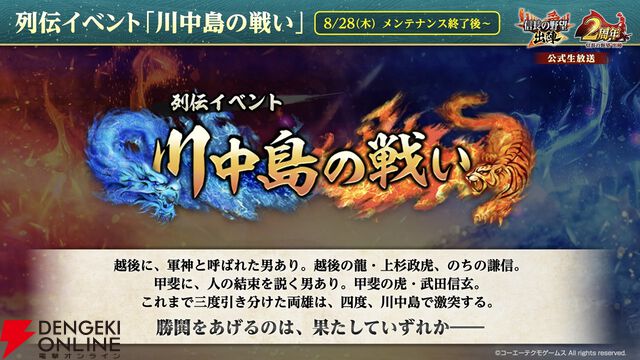 『信長の野望 出陣』2周年記念公式生放送まとめ。列伝イベント“川中島の戦い”、【越後の龍】上杉謙信&【甲斐の虎】武田信玄が8/28に配信決定。天下統一チャレンジや名湯図鑑など、新要素も盛りだくさん