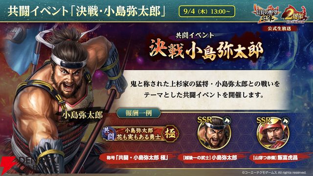 『信長の野望 出陣』2周年記念公式生放送まとめ。列伝イベント“川中島の戦い”、【越後の龍】上杉謙信&【甲斐の虎】武田信玄が8/28に配信決定。天下統一チャレンジや名湯図鑑など、新要素も盛りだくさん
