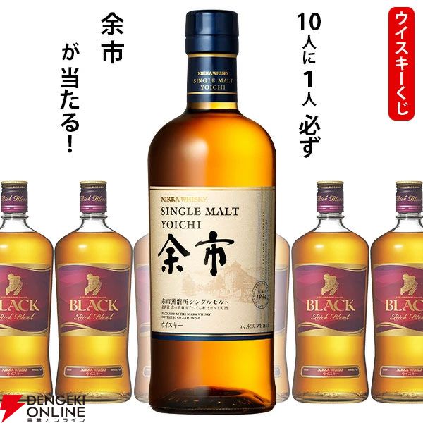1,760円で余市が1/10で当たる。ハズれてもロックにぴったりでおだやかな余韻が心地よいブラックニッカ リッチブレンドが届く『ウイスキーくじ』が販売中