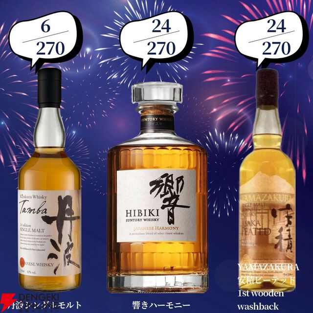 創業記念の豪華版。22,000円で響30年、マッカラン25年、山崎・白州18年、響21年などが当たる2本セットの『ウイスキーくじ』が販売中