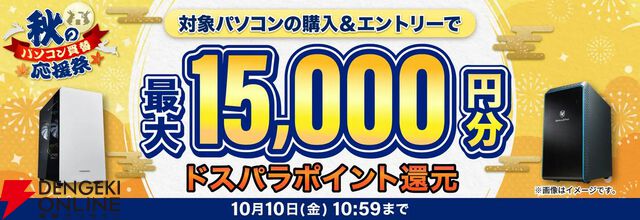 【ドスパラ】対象ガレリアゲーミングPC購入で最大15,000円分ポイント還元。“秋のパソコン買替応援祭”10/10(金)10:59まで
