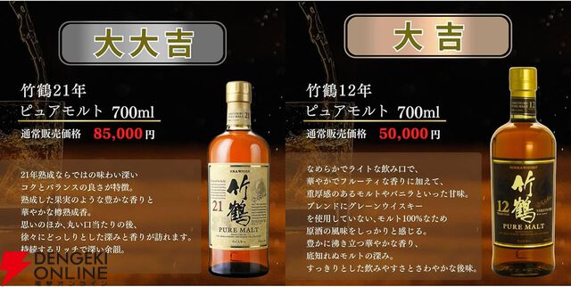7,980円で余市20年、竹鶴21年、竹鶴12年、山崎10年、響17年など希少な銘柄を狙えるレジェンド『ウイスキーみくじ』第2弾が販売中