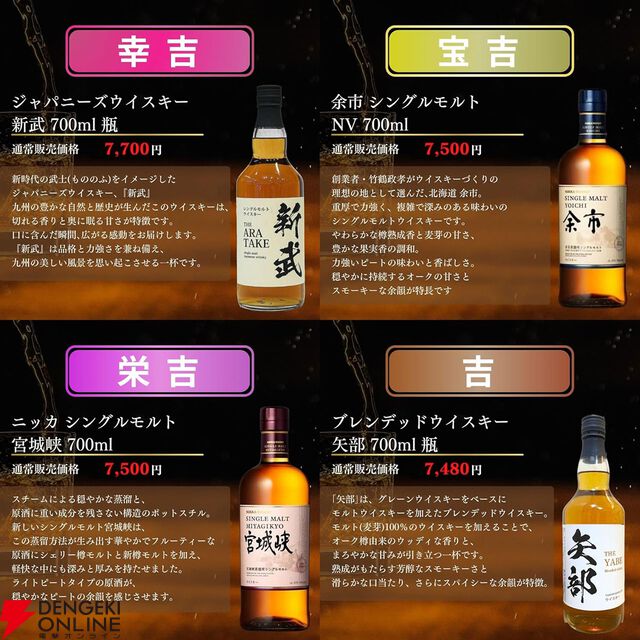 7,980円で余市20年、竹鶴21年、竹鶴12年、山崎10年、響17年など希少な銘柄を狙えるレジェンド『ウイスキーみくじ』第2弾が販売中
