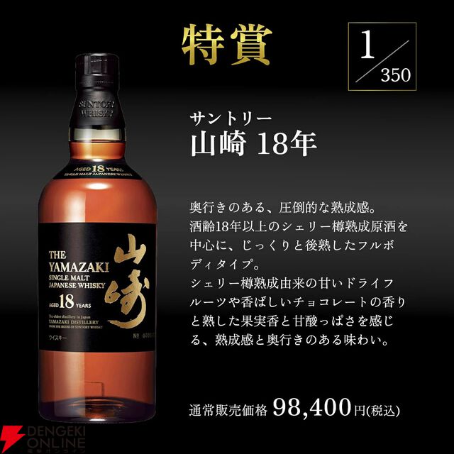 12,500円で山崎18年、グレンベリット30年、響21年、アランモルト25年などが当たり、末等でもなんと白州NVが届くプレミアムウイスキーくじ第1弾が販売中