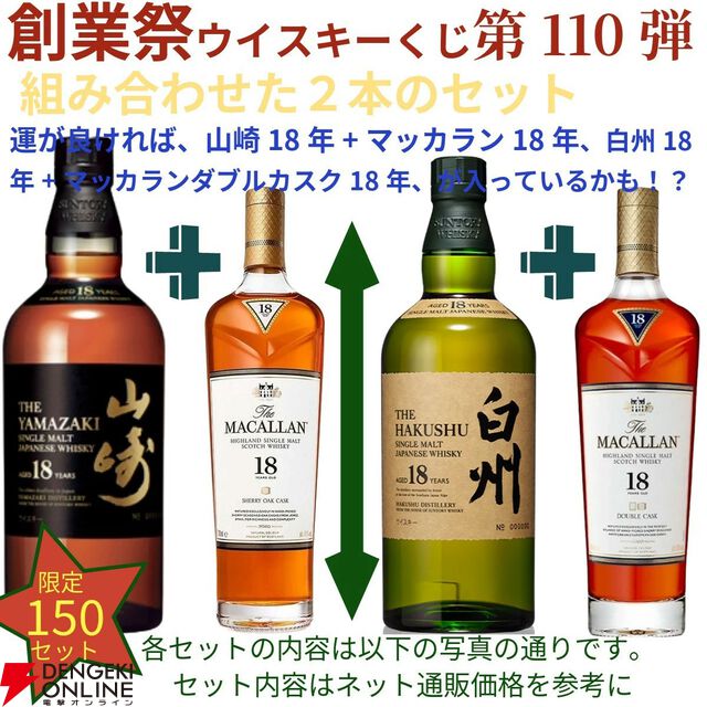 創業祭の豪華版第5弾。24,880円で山崎18年+マッカラン18年シェリー、白州18年+マッカラン18年DCのセットなどが当たる2本セットの『ウイスキーくじ』が販売中