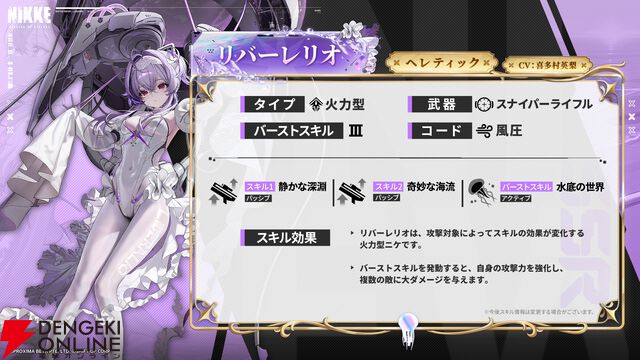 『NIKKE』リバーレリオ(声優:喜多村英梨)情報まとめ。音に対して非常に敏感で、騒がしい環境を何よりも嫌うヘレティックの一角【勝利の女神:NIKKE(メガニケ)】