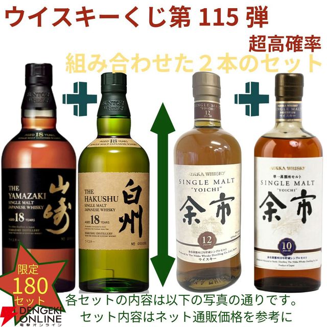 まだ終わっていなかった豪華創業祭! 22,000円で余市12年+余市10年、スプリングバンク15年+厚岸 立秋、山崎・白州18年のセットなどが当たる2本セットの『ウイスキーくじ』が販売中