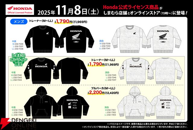 Honda(ホンダ)公式ライセンス商品がしまむらで11/8(土)より販売開始。オンラインストア限定のトレーナー&プルパーカーも