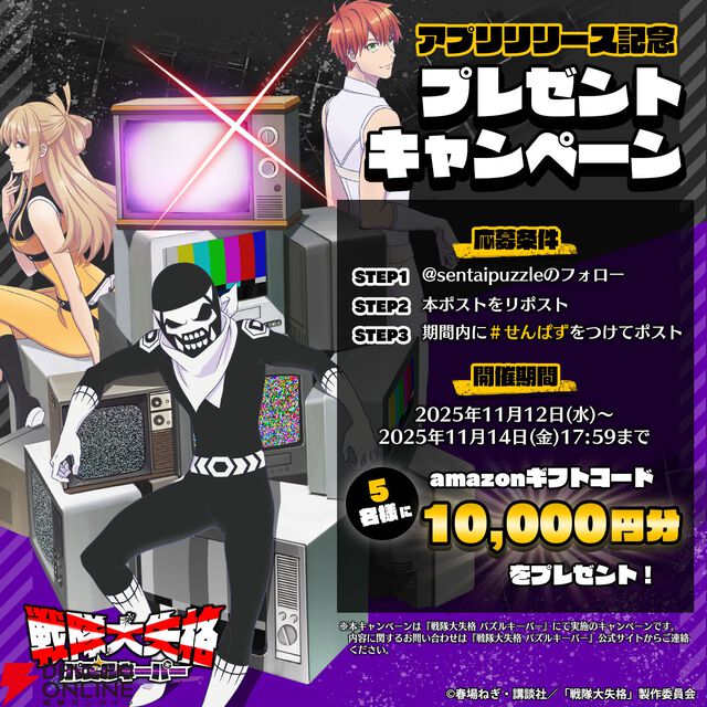『戦隊大失格』初のアプリゲーム『せんぱず』がリリース開始。声優直筆サイン色紙やギフトコード1万円分が当たる豪華キャンペーンも開催中!【戦隊大失格 パズルキーパー】