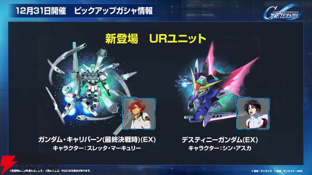 『Gジェネ エターナル』12/23新情報まとめ。UR キャリバーン(最終決戦時)(EX)/UR スレッタとUR デスティニーガンダム(EX)/UR シン・アスカが大晦日に登場!