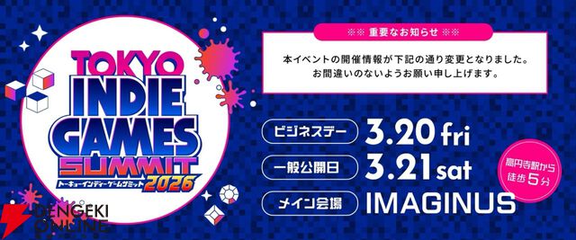 インディゲームの祭典“TOKYO INDIE GAMES SUMMIT 2026”開催日が2026年3月20・21日に延期。会場も変更に【TIGS2026】