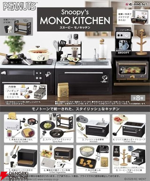 スヌーピーのキッチンミニチュア『スヌーピー Snoopy's MONO KITCHEN』が予約受付中。モノトーンで統一されたデザイン、全8種がそろうBOXが今なら28%OFF!