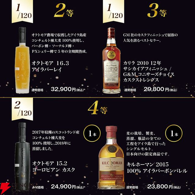 14,200円でアードベッグ25年、オクトモア16.3アイラバーレイなどを狙えるアイラのスモーキーウイスキー限定『ウイスキーくじ』第16弾が販売中