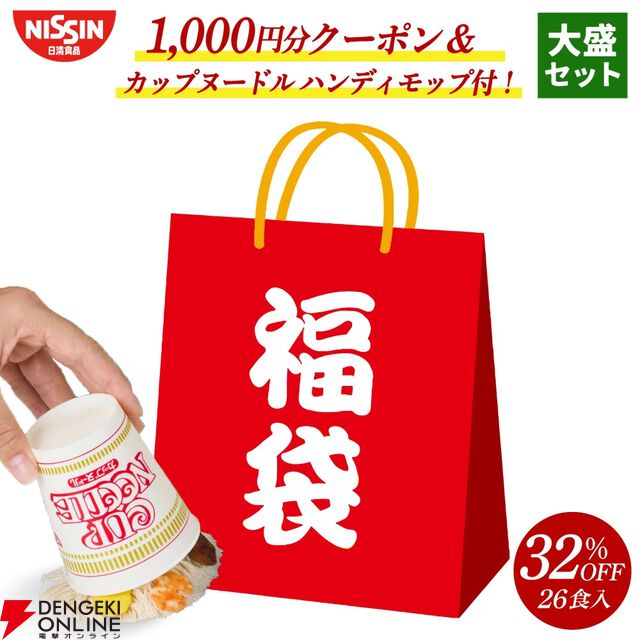 【カップヌードル福袋】日清食品の『ミステリー福袋』2種が好評販売中。中身はヒミツだけど32%~40%OFF、次回使える1,000円分クーポン&カップヌードルハンディモップ付き