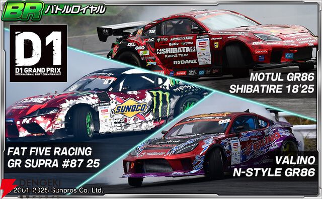 『ドリフトスピリッツ』D1グランプリシリーズとのコラボで齋藤太吾選手、中村直樹選手、日比野哲也選手の車両が新登場。横井昌志選手の車両が手に入るチャレンジパスも