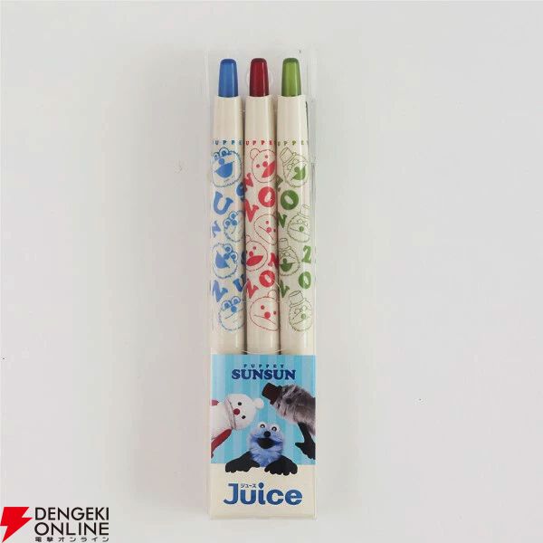【パペットスンスン×Juice】スンスンやノンノンたちのイラスト入りボールペン3色セットが登場。持ち運びに便利な透明ケース付き♪
