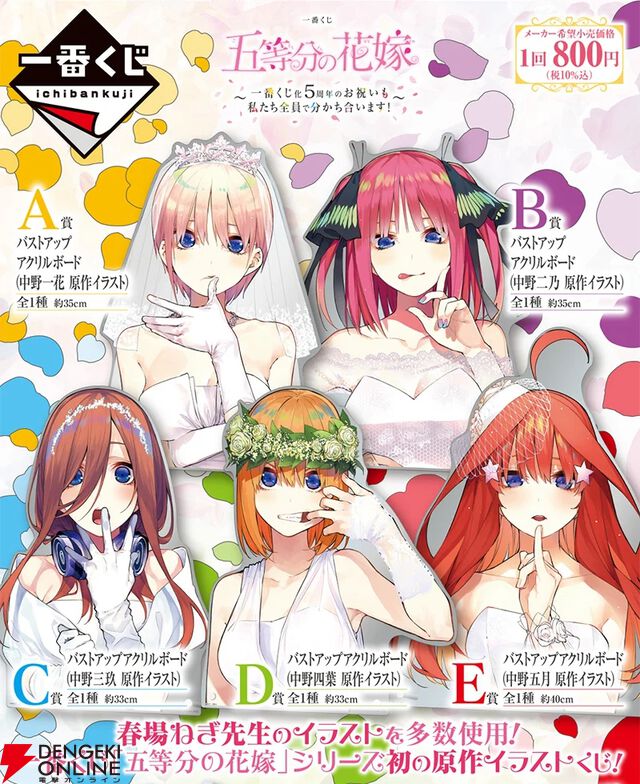 『一番くじ 五等分の花嫁 ~一番くじ化5周年のお祝いも私たち全員で分かち合います!~』がオンライン販売開始。景品の目玉は五つ子たちのバストアップアクリルボード♡