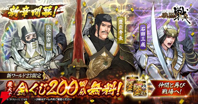 『戦国IXA(イクサ)』2/6より新章開幕! 豊臣秀長や石田三成、大谷吉継など12武将が実装。200回分の無料の金くじや各種キャンペーンも開催中