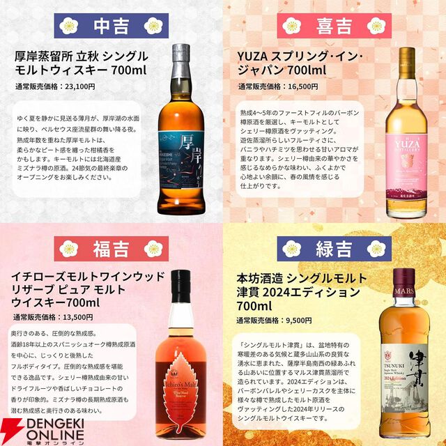 5,500円で余市15年が狙える。山崎・白州12年、厚岸 立秋、YUZAスプリングなども入ったウイスキーくじが販売中