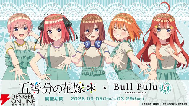 アニメ『五等分の花嫁*』とタピオカドリンクのお店“Bull Pulu”のコラボが3/5より開催。“春のお出かけ”をテーマに描き下ろしたコラボグッズも発売