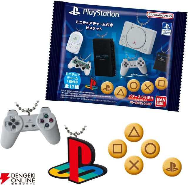 食玩『PlayStationミニチュアチャーム付きビスケット』が発売。懐かしの初代PS、PS2のハードやコントローラ、メモリーカード、ポケステなどがミニチュアチャームに!