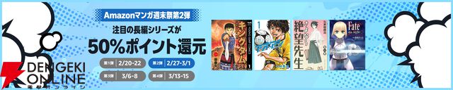 実質半額の《Amazonマンガ週末祭》第2弾が開催中。『キングダム』『ワンピース』『頭文字D』『ゴールデンカムイ』などの人気作が金・土・日限定で50%還元!【3/1(日)まで】