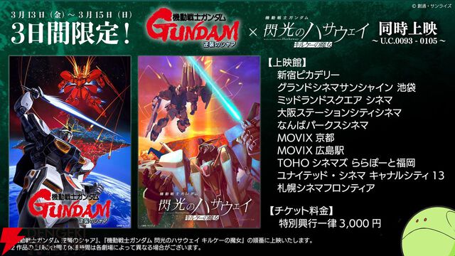 『閃光のハサウェイ キルケーの魔女』と『逆襲のシャア』の同時上映実施決定。3月13日~3月15日限定で全国10館にて