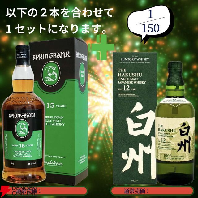 今回は当たりが2倍近くに増量! 21,880円でスプリングバンク18年+山崎12年、スプリングバンク15年+白州12年のセットなどを狙える2本セットの『ウイスキーくじ』が販売中