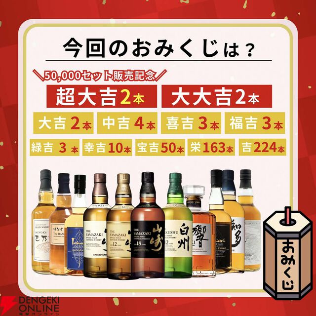 5万セット販売記念で山崎18年がいつもの2倍。3,980円で山崎18年、山崎・白州12年を狙えるウイスキーくじが販売開始
