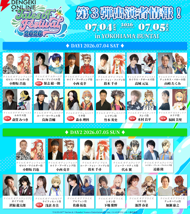 “テイルズ オブ フェスティバル 2026”出演者第2弾が公開。『エターニア』キール役の保志総一朗さんや『ザ テンペスト』ルキウス役の斎賀みつきさんなど6名が発表