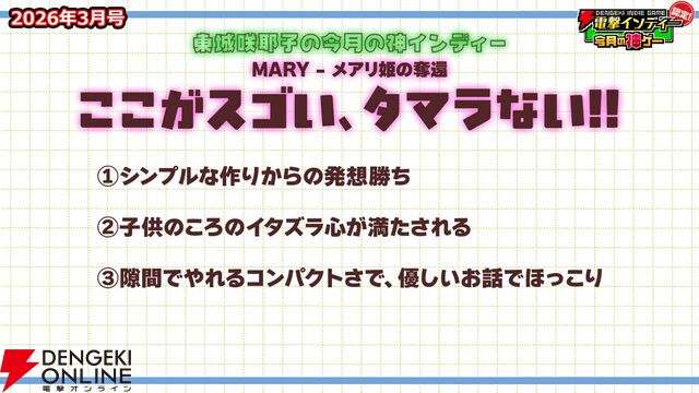 【今月の神ゲー:電撃インディー認定】『MARY - メアリ姫の奪還』ほか、『Creature Kitchen』『Dyping Escape』『敏感!恋のアンテナ ビンビン別嬪荘』など11作をプッシュ(2026年3月)