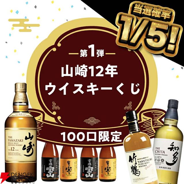 12,800円で山崎12年が1/5で当たる。ハズれは竹鶴or知多+人気の焼酎2本の3本セットの『ウイスキーくじ』が販売中