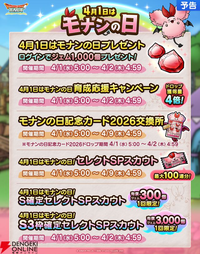 『ドラクエタクト』4/1はモナンの日! 1,000ジェムもらえるログインボーナスに加え、育成キャンペーンや特別なSPスカウトなど内容もりだくさん【エイプリルフール】