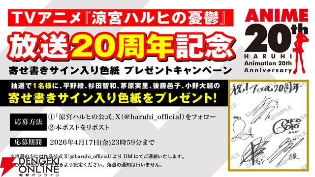 『涼宮ハルヒの憂鬱』放送開始から20周年! いとうのいぢ描き下ろしビジュアル、 20周年記念PVが解禁。SOS団キャストのメッセージ動画や展示会開催など記念企画情報を公開