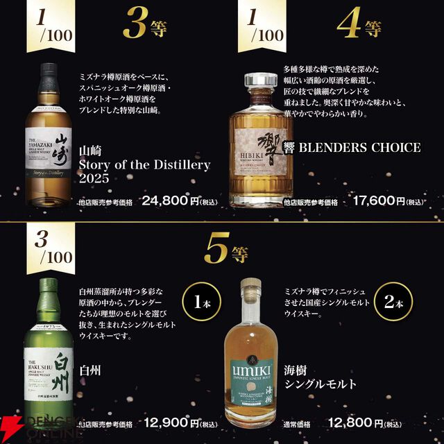 8,390円で響21年、山崎12年、山崎山崎Story of Distillery2025、響BCを狙えるウイスキーくじが販売中