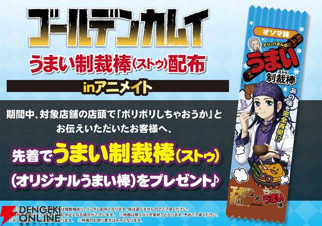 アニメ『ゴールデンカムイ』特製オリジナルうまい棒“うまい制裁棒(ストゥ)”リバイバル配布会の開催決定ッ!!