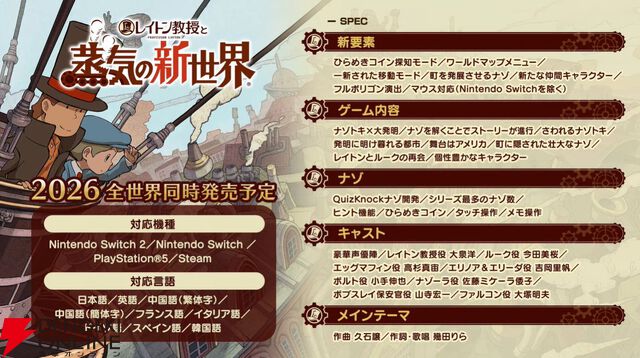 『レイトン教授と蒸気の新世界』2026年末発売。吉岡里穂、高杉真宙、小手伸也ら新キャスト発表。ナゾ制作はQuizKnock(クイズノック)【LEVEL5 VISION 2026 匠】