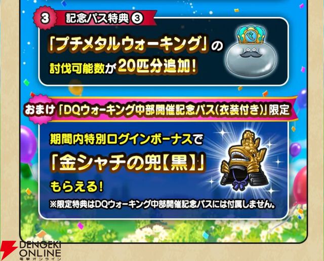 『ドラクエウォーク』プチメタルウォーキングが全国各地で出現中。DQウォーキング中部開催記念パスの販売もスタート、衣装付きでは金シャチの兜【黒】が入手可能