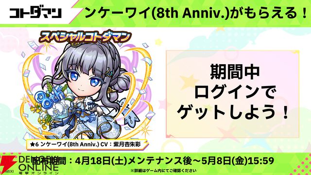 『コトダマン』8周年記念イベントが4月18日より開催。新グランドコトダマン“ンヘループ(天佑)”登場! 虹のコトダマ5,000個もらえる