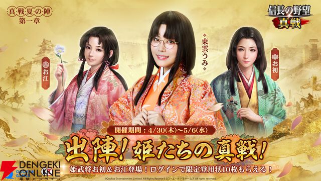 『信長の野望 真戦』GWイベント開催。鬼頭明里、日高里菜演じる新武将が参戦&豪華ログインボーナスが決定。 東雲うみ特別企画や女性VTuber30名による対抗戦などイベントも実施