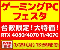 <画像1/4>パソコン工房、GeForce RTX4080/4070Ti/4070搭載モデルを台数限定で用意した“ゲーミングPCフェスタ”開催 公開日時 2024年01月24日(水) 19:40 本文に戻る 次へ
