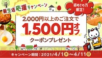 初めてなら今がチャンス! 出前館で2,000円以上の注文すると1,500円引きに