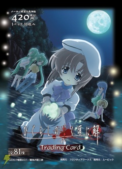 【TVアニメーション「ひぐらしのなく頃に解」ブース特典】 TVアニメーション「ひぐらしのなく頃に解」関連商品を2,500円以上購入した人に、下記のコミケ73ブース限定特典を先着順にて配布する。但し、コミケ73初売り「ひぐらしのなく頃に解」CDと、実写映画「ひぐらしのなく頃に」関連商品は対象外とのこと。 【特典物】 ・非売品DVD「お持ち帰り~☆ミニDVD 2007WINTER」 内容:TVアニメーションDVDに未収録の「ひぐらしのなく頃に解」オープニングテーマ「奈落の花」、エンディングテーマ「対象a」のノンテロップバーション他、お楽しみ映像を収録 (1人1セット限り・搬入数限定1,000セットを予定) |
