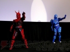 上映を前にしてタッグを組んだ2人のライダーは、“キバ”が秋山さんを助け、その間に“電王”が“ネガタロス”と戦うというみごとな連携を披露。2人の見せた「ダブルアクション」に恐れをなしたか(定かではない感じでしたが)、“ネガタロス”はステージ裏に撤収し、秋山さんを救った2人のライダーが観客の前に姿を見せてくれました。