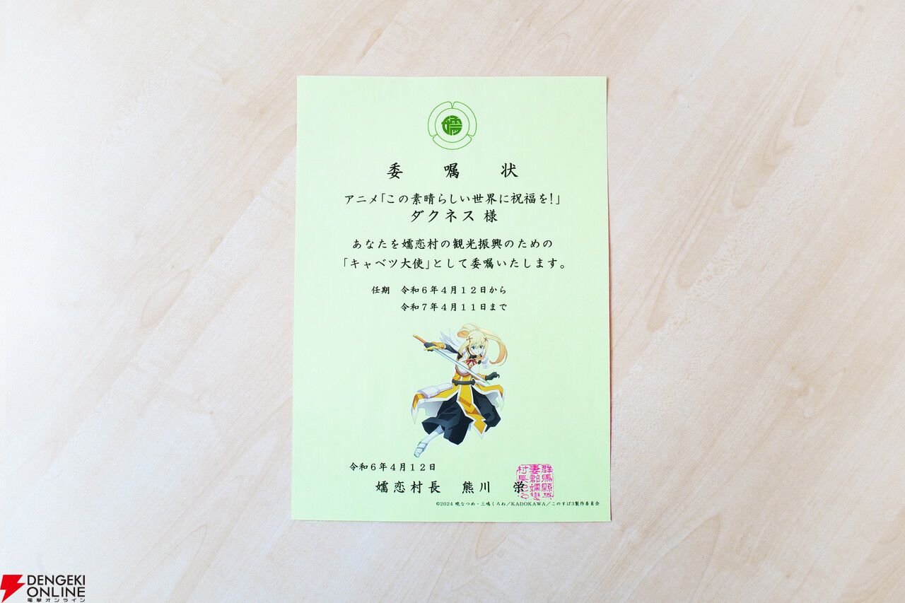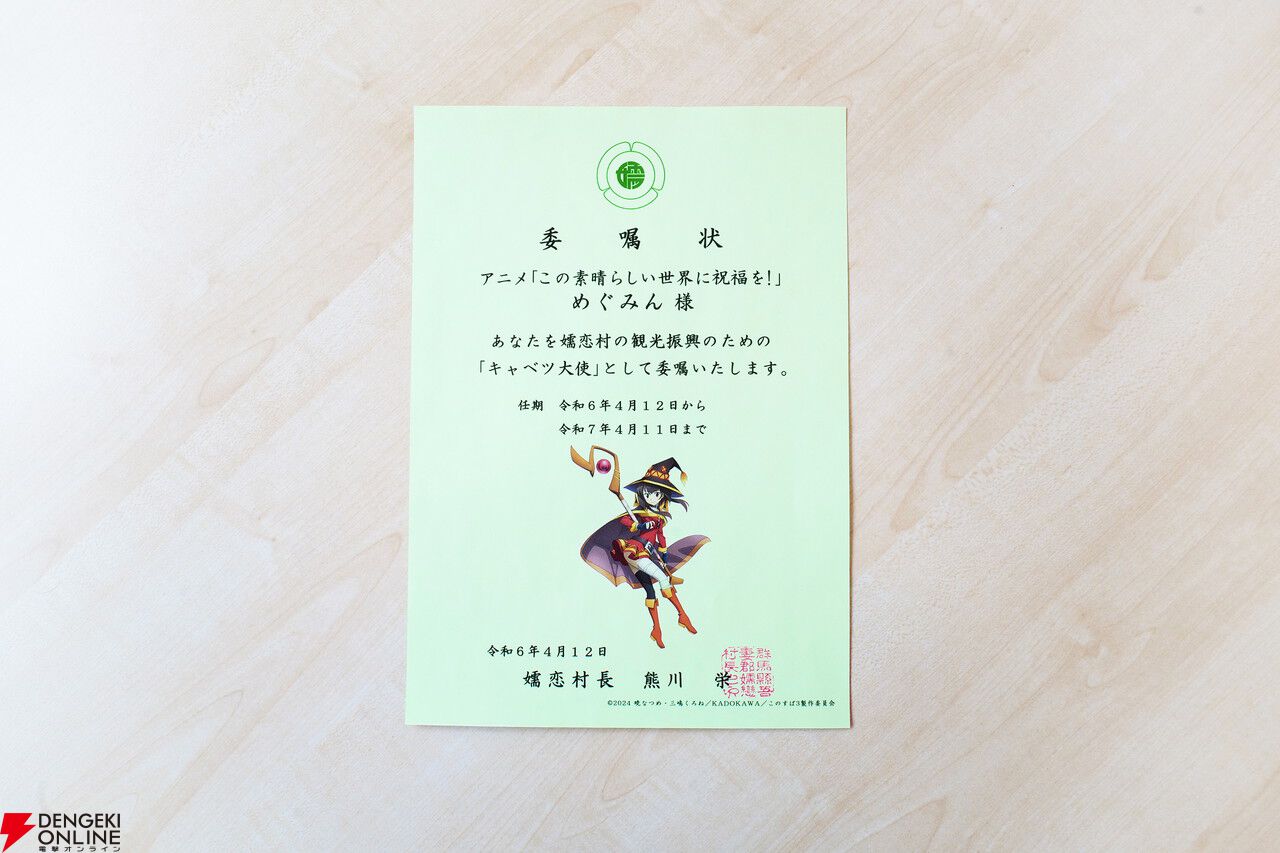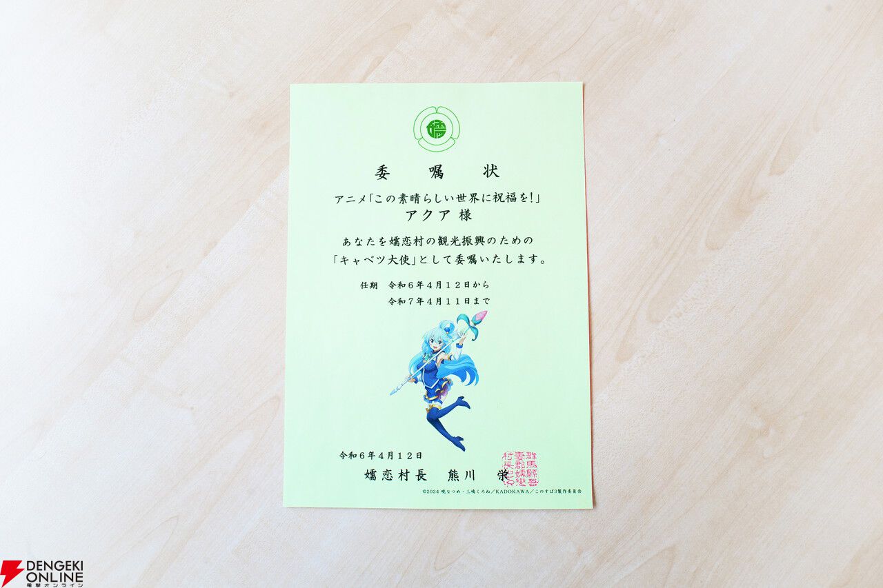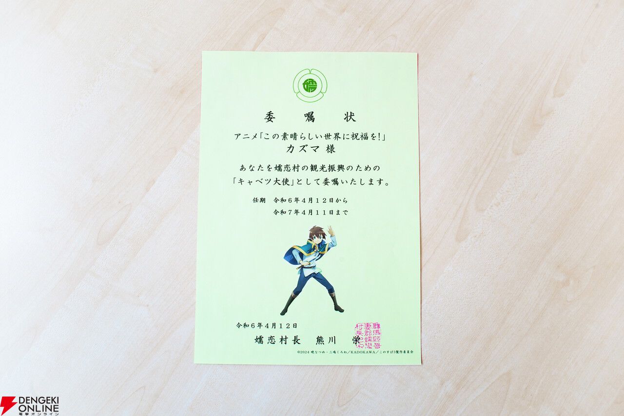 アニメ『この素晴らしい世界に祝福を!』カズマ、アクア、めぐみん、ダクネスが“嬬恋村キャベツ大使”に就任